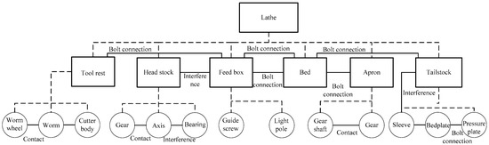 The feasibility of the proposed method is verified by taking the DfRem for a certain type of ordinary lathe as an example. The lathe is required to be a horizontal lathe, and the maximum cutting rotation diameter is 400 mm. The ordinary lathe is mainly composed of a gearbox, guide rail, bed body, tool holder, and tailstock. First, it is necessary to construct the topological structure network of the lathe, as shown in Figure 6.