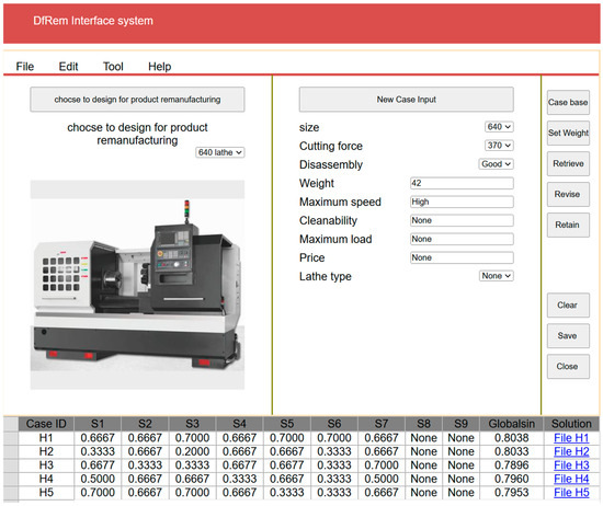 To expedite DfRem scheme generation, a case-based reasoning (CBR) application was implemented using Visual Studio and SQL Server. This application automates the retrieval of similar cases, as illustrated in Figure 8. The process begins with the selection of a candidate product for DfRem and the inputting of corresponding attribute values for each remanufacturability demand. Users subsequently assign weight values to each attribute. The system then queries the case base for similar cases based on these weighted attribute values. The retrieval process contains three parts, outlined as follows. (1) If the similarity score falls below 0.8, the existing case requires modification until it exceeds this threshold before being saved to the knowledge base. (2) If no similar case is identified, a new case can be created and stored for future reference. (3) When the similarity score exceeds 0.8, the case is directly applicable and saved to the case base. Continuously archiving successful or revised cases enhances the diversity of case types, thereby improving case retrieval success rates. Compared to traditional DfRem methods, such as the two-stage QFD model, which necessitates labor-intensive manual processing of extensive failure data to identify product features and DfRem criteria, this intelligent approach processes demand analysis more efficiently, enabling the more rapid generation of the DfRem scheme.
