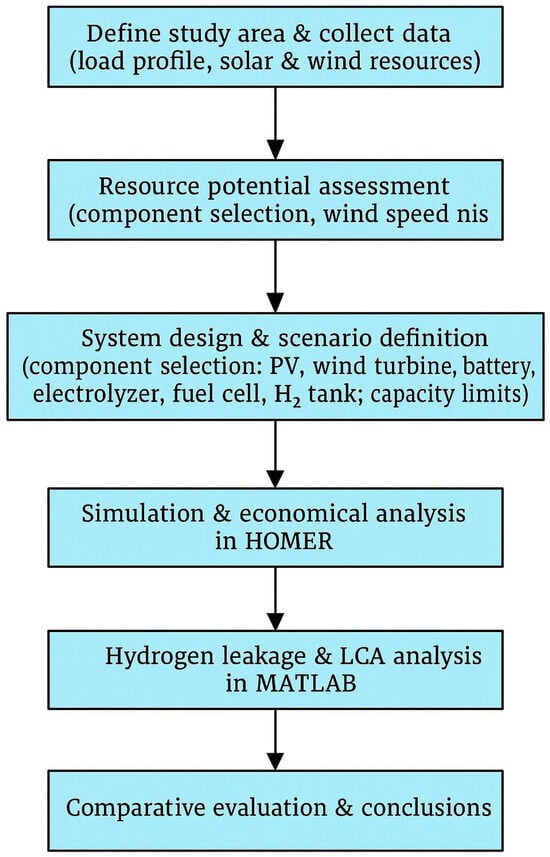 In the environmental analysis, in addition to the direct carbon emissions calculated by HOMER Pro, hydrogen production, storage, and consumption processes were evaluated with a life cycle analysis (LCA) approach. In addition, the carbon footprint of system components due to production and the impact of hydrogen leakage on indirect global warming potential were calculated and compared on a scenario basis []. These analyses reveal that environmental sustainability should be addressed not only with direct emissions but also with the indirect impacts of component lifetimes, production processes, and hydrogen infrastructure. The flowchart of the steps followed in this study is given in Figure 1.