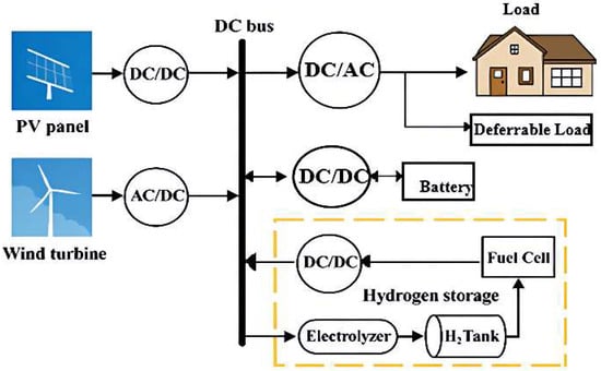 The software models electricity generation, storage, hydrogen production and consumption, and economic outcomes to determine the most efficient system configuration. In this study, the hydrogen related components available in HOMER, namely the PEM electrolyzer, hydrogen storage tank, and fuel cell, are explicitly included to evaluate the long-term storage capacity and ensure supply reliability in different operational scenarios. During the optimization, HOMER varied the component capacities in user-defined ranges to minimize the Net Present Cost (NPC), while also calculating the Levelized Cost of Energy (COE), renewable rate, and operational feasibility. In this way, the methodology provides a transparent and reproducible framework for scenario-based comparisons of technical feasibility and economic sustainability. Figure 2 shows the overall energy flow of the hybrid system with PV-wind generation and hydrogen and battery storage infrastructure and highlights the control logic between the main components.
