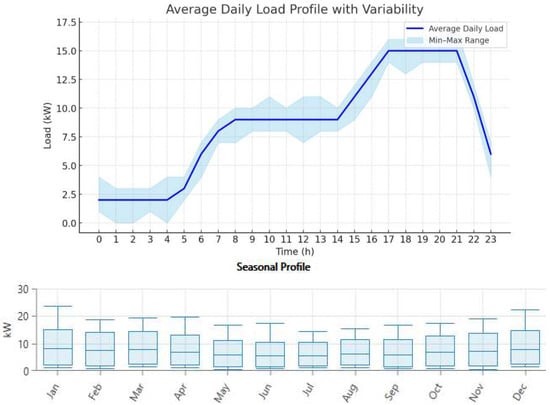 The load profile was modeled with annual hourly data in HOMER Pro 3.14.2 software; the load factor was determined as 0.29 and the peak load as 23.7 kW. In addition, time-flexible energy demands (agricultural irrigation, hydrogen production, etc.) were modeled as Deferrable Load and contributed to the utilization of renewable generation surpluses. The load profile for Küçük Güney (Manisa, Soma) settlement is presented in Figure 3.
