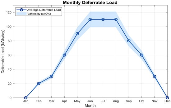 According to the profile presented in Figure 4, the annual average value of this flexible load is 58.33 kWh/day and varies seasonally. The maximum value is defined as 110 kWh/day in summer (June–August) and the minimum value is defined as 0 kWh/day in winter (January and December). This flexible load is limited by 10 kW peak power and 100 kWh short-term storage capacity in the system.