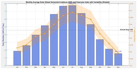 Monthly mean Global Horizontal Irradiance (GHI) with monthly variability for the study site (kWh m−2 day−1). Source: Solar Global Atlas.