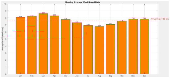These components were selected to ensure sustainability, reliability, and economic viability. Their technical and economic specifications were entered into HOMER Pro to simulate and optimize system performance under realistic conditions. Both solar and wind datasets provided only monthly averages. Clearness index values allowed for partial seasonal variability in the solar data (Figure 6), while there was no such variability in the wind data (Figure 7). Therefore, the HOMER Pro simulations used deterministic average inputs for both sources.