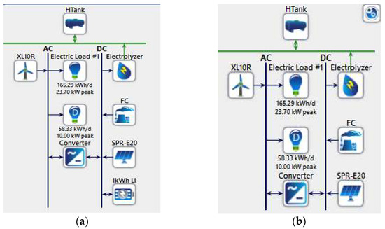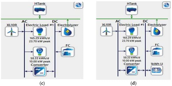 Off-grid system scenarios: (a) PV–Wind–Battery–Electrolyzer–Fuel Cell, (b) PV–Wind–Electrolyzer–Fuel Cell, (c) Wind–Electrolyzer–Fuel Cell, and (d) Wind–Battery–Electrolyzer–Fuel Cell.