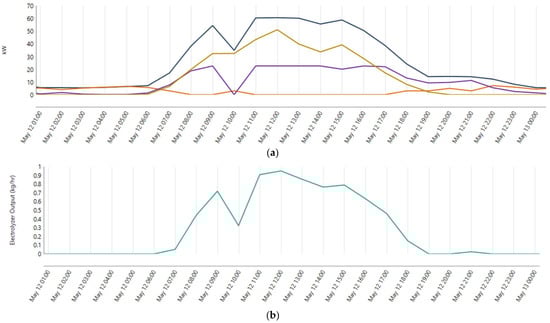 The electrolyzer capacity was sized considering the energy requirement of 50–55 kWh for 1 kg of hydrogen production []. The 270–275 kWh/day energy amount required for 4.93 kg of hydrogen production per day requires an electrolyzer capacity of 50–55 kW during the average 5-h period when solar production is intense [].