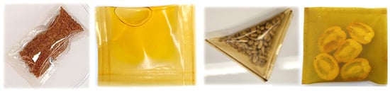Fast-dissolving edible films offer great potential, particularly in portioned dry foods and premeasured ingredient packets. Some examples of these edible pouches from our previous research are presented in Figure 4. Those structures enhance convenience in consumer goods and food production by enabling precise measurements without the need for scoops or skilled labour. Additionally, these films seal pouches tightly, extending food shelf life by controlling mass transfer. It is essential to achieve both rapid dissolution and protective functions for their effective integration into various food packaging applications [27].