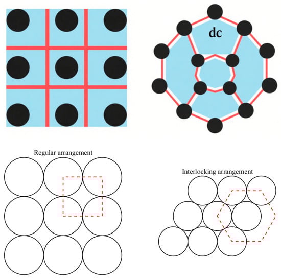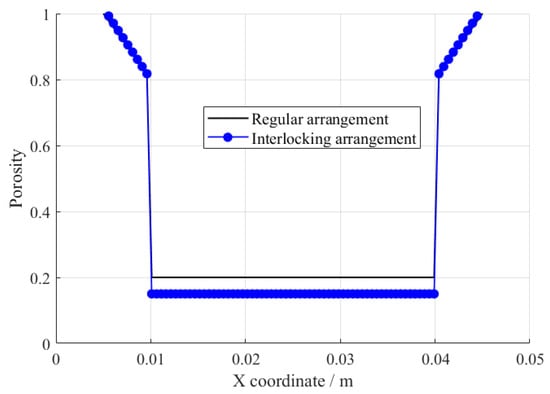 For verifying the calculated porosity values, two densely packed particle arrangements were analyzed. As shown in Figure 1, regularly arranged and staggered configurations were taken into account, resulting in porosities of roughly 0.21 and 0.1, respectively. SPH particles were evenly dispersed within the computational domain. Porosity calculations were carried out in the central region of the domain, and the outcomes are plotted in Figure 2 as a function of the particle X-coordinate. As demonstrated in the figure, the porosity values obtained from Equation (3) were in good agreement with the theoretical predictions.