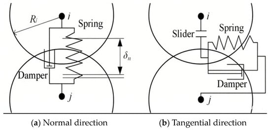 As shown in Figure 3, for each pair of interacting DEM particles, contact force is enforced by a spring, a damper, and a slider. It can be divided into normal contact force and tangential contact force :