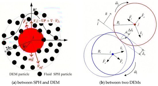 The key aspect of SPH-DEM coupling is to facilitate interactions between the two types of particles. Within the implicit coupling framework, the coupling forces that regulate solid–fluid interactions are depicted in Figure 4. Through the application of kernel smoothing methods, the interphase coupling radius is set as Rc = 2hc. For the discrete element particle i, the governing equation can be expressed as follows: