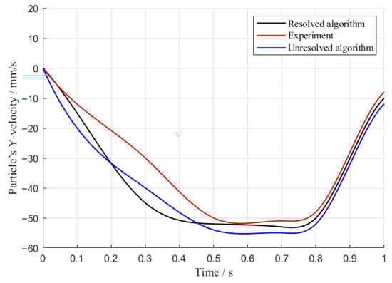 The variation curve of particle velocity with respect to time is presented in Figure 5. The particle sedimentation process simulated by the coupling algorithm shows good consistency with the experimental results, with only minor discrepancies in the acceleration phase, deceleration phase, and collision moment (t = 0.74 s). During the accelerated sedimentation of the particle, as the relative velocity between the DEM particle and fluid SPH particles increases, the drag force component rises progressively, while the hydrodynamic component exhibits no significant change. This causes the force exerted on the DEM particle by the fluid to increase gradually and approach its own gravity, causing the particle’s acceleration to diminish to zero. The acceleration process thus exhibits nonlinear characteristics. At t = 0.74 s, the particle comes into contact with the bottom boundary. Under the action of the soft-sphere contact model, the particle undergoes multiple rebounds, with its potential energy gradually dissipated until it finally comes to rest at the bottom boundary.