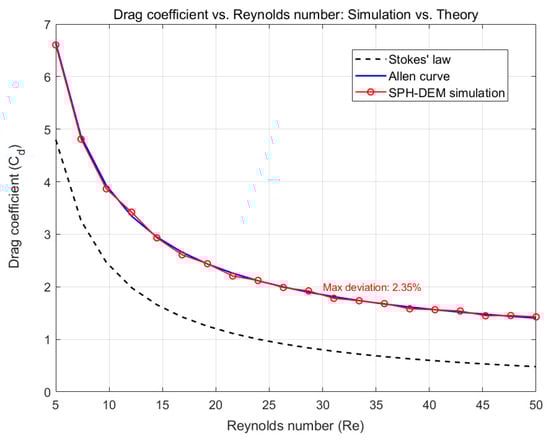 To further validate the versatility of the unresolved SPH-DEM framework across different flow regimes, additional single-particle sedimentation tests under varied Reynolds numbers (Re) were conducted. Three sets of cases were designed by adjusting particle diameters (0.5 mm, 1 mm, and 2 mm) and fluid dynamic viscosities (0.001 and 0.01 Pas), covering a Re range of 5 to 50. For each case, the drag coefficient (Cd) was calculated using the simulated hydrodynamic forces, following the definition