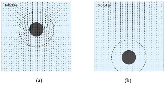 Figure 8 illustrates the velocity distribution of the flow field during the single-particle sedimentation process. At t = 0.33 s, it is observable that the particle is moving at a constant speed. Under the influence of the fluid–solid coupling force, the surrounding fluid SPH particles generate a stable vortex, as depicted in Figure 8a. At t = 0.64 s, the DEM particle draws near the bottom boundary. Fluid SPH particles positioned beneath the particle begin to move upward due to the squeezing effect of the DEM particle and the bottom boundary, as presented in Figure 8b. With regard to fluid SPH particles within the coupling radius Rc of the DEM particle, their porosity is below 1.0, and they are affected by the local averaging effect. As the particle nears the bottom boundary (t = 0.64 s), the fluid develops a local pressure buildup near the bottom boundary; this causes the hydrodynamic term of the DEM particle to rise and exceed its own gravity, leading to the particle’s deceleration.