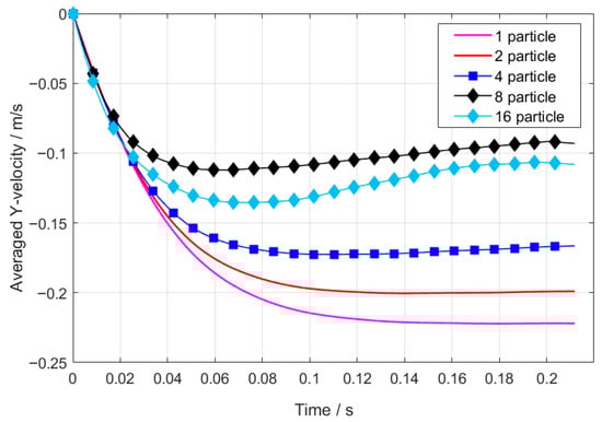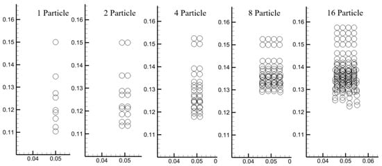 The collective sedimentation velocity exhibits a pronounced decreasing trend, as particle numbers increase from 1 to 8, primarily attributed to enhanced energy dissipation caused by increased interparticle collision frequency and intensified fluid–particle coupling effects. As shown in the particle trajectory plots (Figure 12), this progressive velocity reduction demonstrates clear particle-number dependence. However, when particle quantity reaches 16 (arranged in a 4 × 4 tightly packed configuration), distinct kinetic stratification emerges—the bottom-layer particles, subjected to gravitational compression from upper layers and driven by local flow field pressure gradients, form accelerated sedimentation zones that create significant velocity separation from upper particles. This nonuniform sedimentation characteristic results in an anomalous velocity recovery, where the 16-particle system achieves higher average sedimentation velocity than the 8-particle system. These findings reveal how spatial configuration regulates collective sedimentation behavior in densely packed systems through mechanically coupled gravity–flow field interactions.