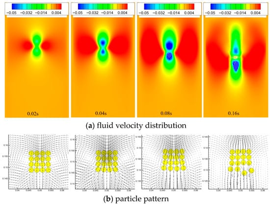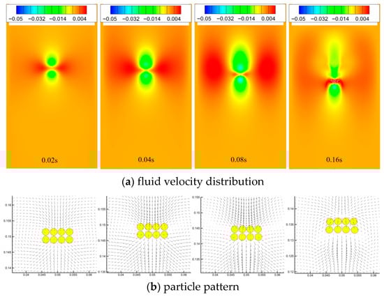 The evolution analysis of 8-particle and 16-particle systems (Figure 10 and Figure 11) reveals significant spatial reorganization during sedimentation. The initially tightly packed square configuration undergoes structural differentiation at t = 0.04 s, evolving into a chain-like structure characterized by front-concentrated and rear-dispersed particle distribution. By t = 0.16 s, distinct longitudinal stratification emerges: leading-edge particles accelerate due to preferential occupation of low-resistance flow channels, while trailing particles experience velocity reduction under wake occlusion effects. With increasing particle numbers, the system stabilizes into a dual-layer configuration. Upper-layer particles exhibit coordinated motion with lower counterparts through fluid–pressure-field coupling, achieving a collective average velocity of 0.85 times the single-particle terminal velocity. This self-organization stems from asymmetric hydrodynamic pressure distribution among particles—the low-pressure wake regions generated by leading particles attract trailing particle aggregation, while lateral repulsive forces maintain interparticle spacing, ultimately forming a dynamically balanced quasi-crystalline structure.