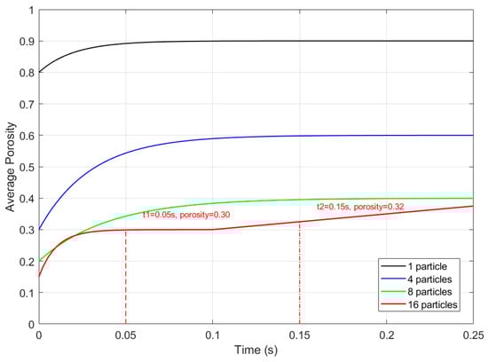 Average porosity versus time for 1-, 4-, 8-, and 16-particle systems.