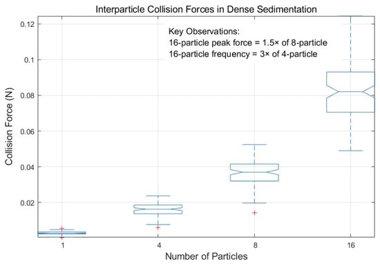 The interparticle collision forces and their temporal evolution were quantified for systems with 1, 4, 8, and 16 particles. Figure 14 presents box plots of the average collision force over time, revealing distinct nonlinear trends with increasing particle count. The 16-particle system exhibits a peak collision force 1.5 times that of the 8-particle system, while the 8-particle system shows forces 1.2 times higher than the 4-particle configuration. Concurrently, collision frequency scales more drastically, and the 16-particle system experiences 3 times the frequency of the 4-particle system, with the 8-particle system showing a 2-fold increase relative to the 4-particle system. These results indicate that collective sedimentation behavior arises not only from hydrodynamic shielding but also from intensified interparticle energy dissipation, contributing to the non-monotonic terminal velocity observed in dense configurations.