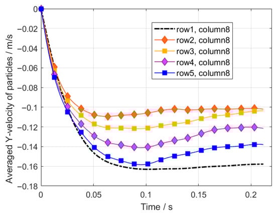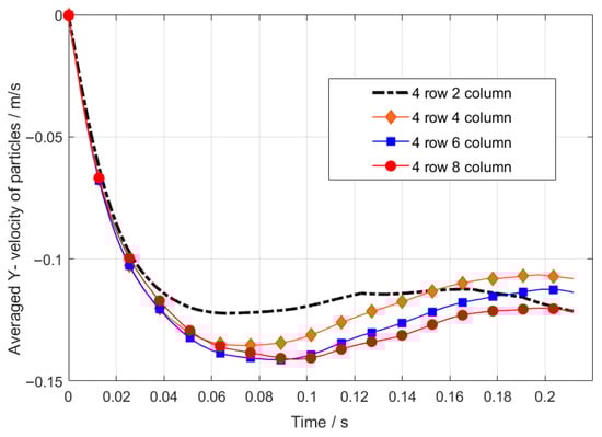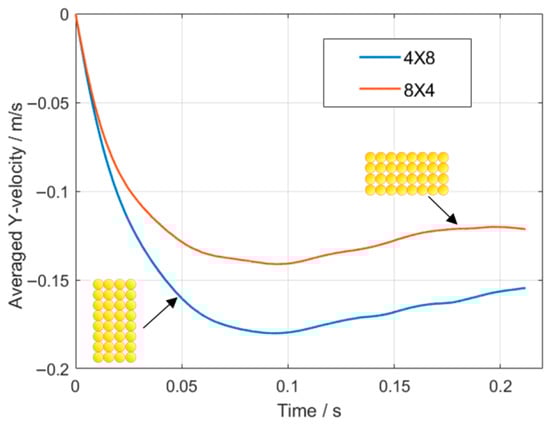The sedimentation dynamics of 32 particles under two distinct configurations (4 × 8 vs. 8 × 4 arrangements) were systematically investigated. The temporal evolution of average settling velocities (Figure 15) reveals a shared three-phase pattern across both configurations: rapid initial deceleration, velocity recovery at ~0.075 s, and stabilization into a terminal velocity plateau. Notably, the 4 × 8 configuration exhibits consistently lower velocities throughout the transient phase compared to the 8 × 4 case. This disparity likely stems from geometric constraints: the elongated 4 × 8 layout amplifies lateral fluid resistance through increased particle–fluid contact area, whereas the compact 8 × 4 configuration reduces cross-sectional blockage, enabling more efficient downward momentum transfer.