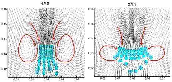 As shown in Figure 17, velocity vector fields elucidate configuration-specific hydrodynamic features. Both systems generate symmetrical counter-rotating vortices flanking the particle clusters, with intensified downward fluid entrainment above the 8 × 4 configuration. The vortex cores in the 8 × 4 case shift closer to particle edges, establishing steeper pressure gradients that drive central-particle acceleration. Comparatively, the 4 × 8 arrangement exhibits broader vortical structures with weaker vertical fluid momentum, resulting in more uniform particle–fluid energy transfer. These observations confirm that aspect ratio governs both macroscopic settling rates and microscopic flow structuring in dense granular suspensions.