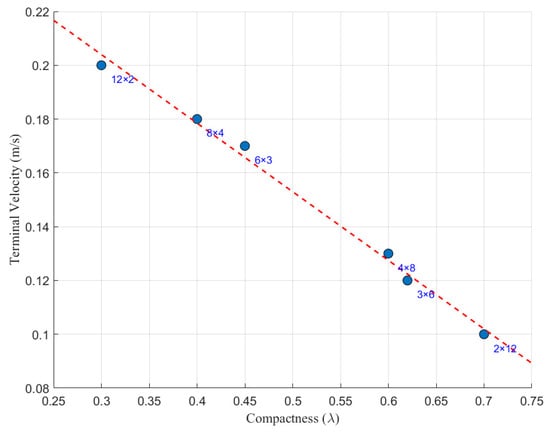 The concept of compactness is introduced, defined as the ratio of the total projected area of particles to the cross-sectional area of the vertical pipe. This parameter directly reflects the degree of flow channel occlusion by particles. Additional simulations were performed for diverse configurations (3 × 6, 6 × 3, 2 × 12, 12 × 2) to expand the dataset beyond the 4 × 8 and 8 × 4 cases. Figure 18 presents the scatter plot of terminal velocity versus compactness, with each data point labeled by its corresponding particle arrangement. As decreases from 0.7 (2 × 12 arrangement) to 0.3 (12 × 2 arrangement), the terminal velocity increases monotonically from 0.10 m/s to 0.20 m/s. The fitted trend line indicates that a 0.1 reduction in is associated with an approximate 0.02 m/s increase in terminal velocity. This trend confirms that lower compactness enlarges the fluid bypass space, reduces hydrodynamic resistance, and thus accelerates collective settling. The 8 × 4 configuration (.4) aligns well with this pattern, exhibiting a 17% higher velocity than the 4 × 8 arrangement (.6) due to its reduced cross-sectional blockage.