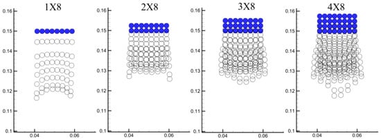 As shown in Figure 23, trajectory analysis reveals that increasing column numbers markedly alter the self-organization characteristics of settling structures. For 2-column and 4-row systems, edge-dominated three-dimensional bypass flows drive alternating acceleration patterns in particles, resulting in oscillatory trajectory behavior. At four columns, central particles shielded by fluid-dynamic effects from adjacent columns form prioritized vertical settling channels, achieving approximately 8% higher terminal velocities compared to edge particles. In 6- and 8-column systems, stratified acceleration emerges: the outermost two columns develop low-velocity boundary layers due to shear flow detachment, while central particles exhibit uniform high-speed motion under pipe-like flow effects. Notably, when column numbers exceed six, accumulated longitudinal stress in bottom particle clusters surpasses fluid–solid coupling thresholds, triggering collective detachment of localized particle groups. This phenomenon indicates that the stability of multi-column systems is governed by nonlinear competition between geometric confinement intensity and fluid-permeation capacity.