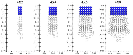 As shown in Figure 16, particle trajectory analysis highlights configuration-dependent migration patterns. The 4 × 8 system demonstrates synchronized descent with minimal stratification, achieving faster bulk settling due to reduced interparticle shielding. Conversely, the 8 × 4 arrangement exhibits pronounced vertical segregation, where centrally aligned bottom-row particles form accelerated sedimentation channels. This kinematic bifurcation arises from differential wake interactions. The narrower 8 × 4 geometry enhances localized flow channeling beneath central particles, while the upper particles experience stronger fluid upwash from symmetric vortex structures, creating competing acceleration/deceleration zones.