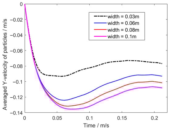Numerical simulation results reveal a significant nonlinear influence of fluid domain width on the collective settling behavior of particle clusters. As shown in Figure 24, when the flow field width increases from 0.03 m to 0.1 m, the average terminal velocity of particles rises from 0.08 m/s to 0.115 m/s, though the growth rate decelerates with increasing width (the velocity increment from 0.08 m to 0.1 m is only 60% of that from 0.06 m to 0.08 m). Under narrow-domain conditions (0.03 m), wall effects dominate particle–fluid interactions: lateral confinement amplifies the adverse pressure gradient, increasing the overall drag on the particle cluster, while particle–wall friction induces additional energy dissipation, significantly suppressing settling velocity. As the domain width expands (≥0.06 m), weakened boundary constraints trigger a transition in fluid bypass modes—symmetric vortex structures form on both sides of the cluster in the wide domain (0.1 m, Figure 24), where vortex-induced lift forces partially counteract particle gravity, whereas the absence of vortices in the narrow domain (0.03 m) results in pure drag dominance. Notably, when the domain width exceeds a critical threshold (approximately 0.08 m), the terminal velocity increment saturates, indicating that particle motion gradually transitions from geometry-dominated to self-similar flow regimes.