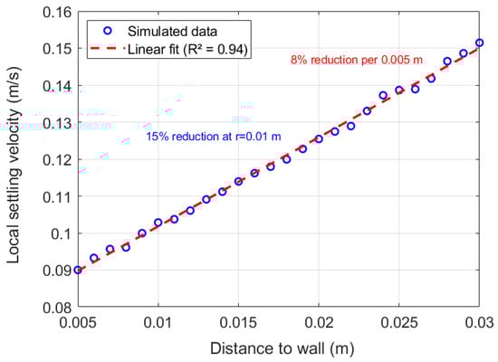 Additional simulations were conducted in a pipe with a width of 0.06 m, focusing on the relationship between particle distance to the wall and local settling velocity. For particles in the same horizontal cross-section, their distance to the nearest wall (r) was measured, and their instantaneous vertical velocity (v) was recorded during the terminal velocity phase. As shown in Figure 27, the local velocity exhibits a clear increasing trend with r, following a near-linear relationship in the range 0.005–0.03 m. Particles adjacent to the wall display a velocity reduction of approximately 15% compared to those at the pipe center, where the wall effect is negligible. A linear fit to the data yields an attenuation coefficient. For every 0.005 m decrease in r, the local velocity decreases by 8%. This trend confirms that wall-induced friction enhances fluid drag on near-wall particles, with the effect diminishing rapidly as particles move toward the pipe center.