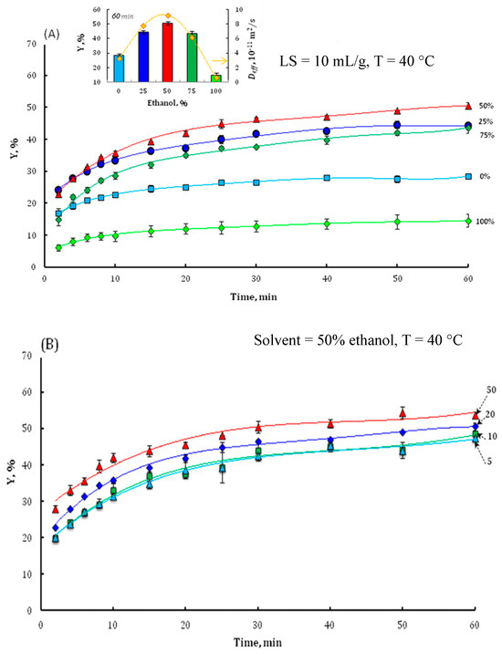 The effect of ethanol concentration (A), liquid–solid ratio (B), and temperature (C) on the TPC extraction yield of walnut bark. Inserts in (A,C) show the values of final TPC yield and effective diffusion coefficient Deff. Insert (C) also shows the Arrhenius plot for solute diffusivity.