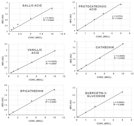 Calibration curves of phenolic compound standards (absorbance vs. concentration).