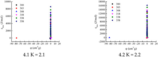 When K = 2.1, 2.2, and 2.3, the adsorption-phase volume φ at certain temperatures (300 K, 303 K, and 308 K) is negative (see Figure 4(4.1–4.3)). Since the adsorption-phase volume cannot be negative under any temperature and pressure conditions, the values of K do not fall within the range of 2.1–2.3.