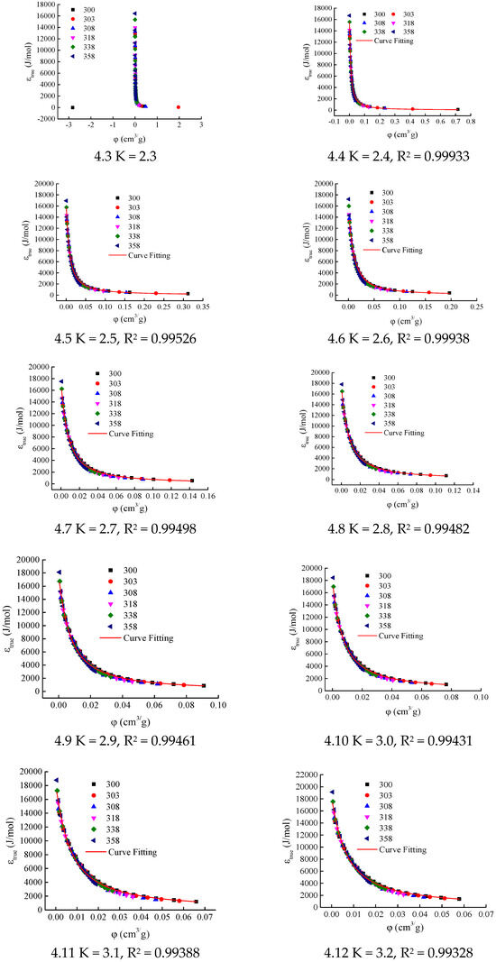 In this study, the excess adsorption isotherms of Holm shale at temperatures of 300 K, 303 K, 308 K, 318 K, 338 K, and 358 K (see Figure 2) were used to calculate the adsorption characteristic curves for different K values. The initial interval for the K value was set as [2.1, 4.0], with an increment of 0.1. The calculation results are shown in Figure 4.