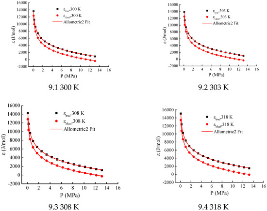 Meanwhile, the degree of dispersion in the ideal gas adsorption potential curves (εideal) at different temperatures increases. Since the LangmuirEXT2 equation (Equation (22)) in Section 3.1 fails to effectively fit the adsorption characteristic curve shown in Figure 9, the author employs the Allometric2 equation for curve fitting. The Allometric2 equation can be expressed as