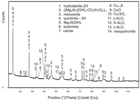 Analyzing the structure of the LDH sample calcined at 500 °C, it can be observed that the original diffraction peaks from hydrotalcite-2H, quintinite, and nesquehonite are no longer present. By-products that decomposed below 450 °C led to the formation of α-Al2O3 and MgO, while those that decomposed above 500 °C formed MgAl2O4, accompanied by a sharp increase in MgO dispersity. Between 350 °C and 500 °C, crystallization of MgO (periclase, JCPDS 96-900-6817) was observed. This behavior is likely attributed to the dehydroxylation of brucite-like layers and the removal of interlayer anions (CO32−). The abundant hydrotalcite phases were transformed into crystalline, non-stoichiometric MgO (JCPDS: 96-900-6817). The compound Mg2Al(OH)7 underwent dehydroxylation to form smaller portions of spinels, such as Mg0.99Al2.01O4 (JCPDS: 96-900-1373) and MgAl2O4. The presence of CuO and CaCO3 is still evident, while new phases of Cu2O (JCPDS: 01-077-0199) and Cu2SO4 (JCPDS: 28-0401) form as a result of CuS decomposition. Amorphous χ-Al2O3 and CaCO3 also remain present in the structure [37].