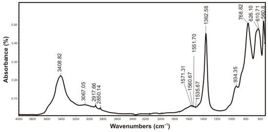 FTIR analysis of uncalcined LDH (Figure 3) provided information about the main functional groups present in the structure of the sample. Region 3600–3200 cm−1 presents a characteristic broad and robust peak centered at 3408 cm−1, with an O-H stretching vibration at the surface and water molecules in the interlayer space [29]. This vibration peak could be attributed to either boehmite or Mg2Al(OH)7 [30]. Several signals were detected between 1800 and 1200 cm−1, such as the bending vibration of water around 1600–1700 cm−1, an infrared (IR) vibration associated with the Mg-Al band at 1571 cm−1, and an intense absorption ν3 vibration of interlayer carbonate at 1362 cm−1—with the lattice vibration of the main layers from 500 to 1000 cm−1 [31]. The IR bands at 768 cm−1 and 560.8 cm−1 are assigned to quintinite-2H [32]. The absorption peak at 1560 cm−1 is ascribed to κ-(Al2O3) [33]. The IR absorption bands from 1000 to 500 cm−1 cover several overlapping bands, which may not be fully interpreted considering that the exact material procedure preparation is unknown. However, absorption peaks at 934 cm−1 and 768 cm−1 could be assigned to the Al-OH bending and stretching vibration, respectively [34].