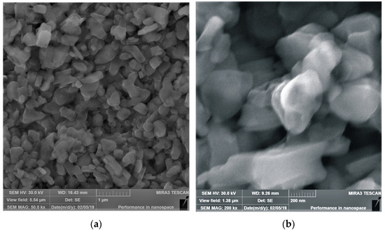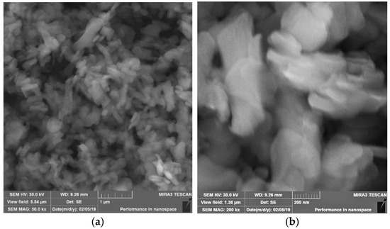 SEM images of hydrotalcite-2H (LDH) calcined at 550 °C (a) ×50,000, (b) ×200,000.