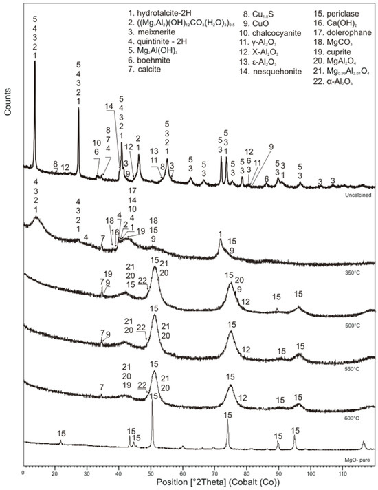 By 600 °C, dehydroxylation and decarbonization of the LDH are essentially complete. The majority of phases in the LDH sample calcined at 600 °C are periclase MgO (JCPDS: 96-900-6804) and spinels. Minor phases such as α-Al2O3 and χ-Al2O3, along with impurities like Cu2O and CaCO3, remain. Based on these observations, it can be concluded that temperatures above 550 °C are not recommended for LDH calcination, as at 600 °C the LDH structure transforms into stable spinel phases, thus losing its ability to rehydrate and reconstruct its structure when in contact with water.