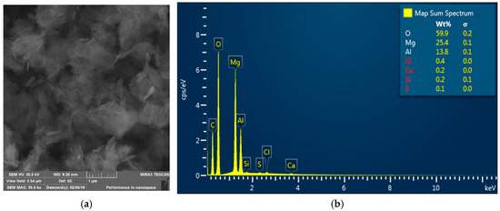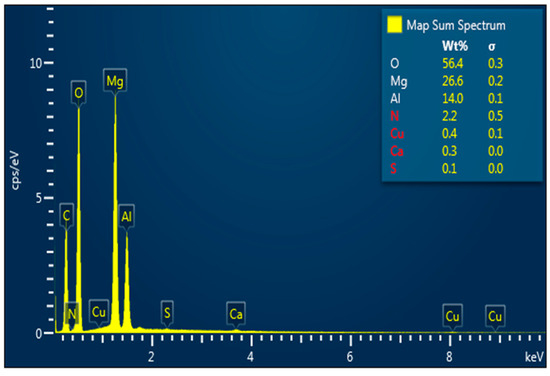 The sample of LDH calcinated at 550 °C was subjected to EDX analysis to obtain its chemical composition, Figure 6.