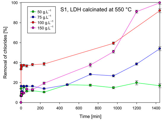 Effect of the dosage of hydrotalcite-2H (LDH) on the removal efficiency of chlorides from synthetic solution S1 with LDH dosage 50, 75, 100, 150 g L−1.