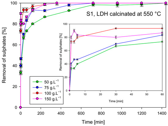 Effect of the dosage of hydrotalcite-2H (LDH) on the removal efficiency of sulphates from synthetic solution S1 with LDH dosage 50, 75, 100, 150 g L−1.