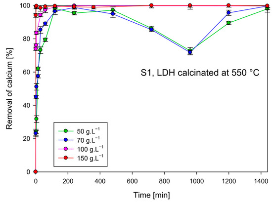 Effect of the dosage of hydrotalcite-2H (LDH) to removal efficiency of calcium from synthetic solution S1 with LDH dosage 50, 75, 100, 150 g L−1.