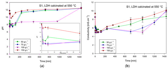 (a) pH and (b) conductivity changes during sorption with hydrotalcite-2H from S1 with different sorbent concentrations (50, 75, 100, 150 g L−1).