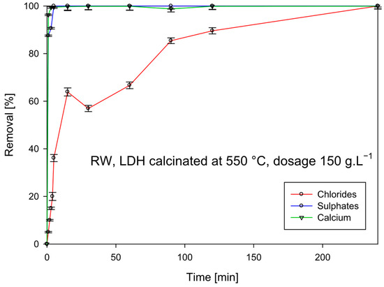 The sorption rates of chlorides (Cl−), sulphates (SO42−), calcium (Ca2+), chromium (Cr), lead (Pb), sodium (Na+), and potassium (K+) were tested using RW with an LDH dosage of 150 g.L−1 over a period of 24 h. Figure 12 illustrates the sorption dynamics for Ca2+, Cl−, and SO42− over the first 240 min of the process.