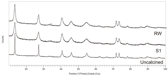 The XRD analysis observed that the adsorbent largely retained its original hydrotalcite structure (Figure 13). The amount of adsorbed ions (Cl−, SO42−) was insufficient to form any new, visible crystalline phases. Notably, the phase of meixnerite disappeared in both the S1 and RW samples.
