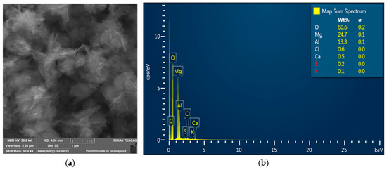 (a) SEM image, (b) EDX analysis of LDH (100 g L−1) after 24 h of sorption from S1.