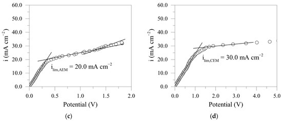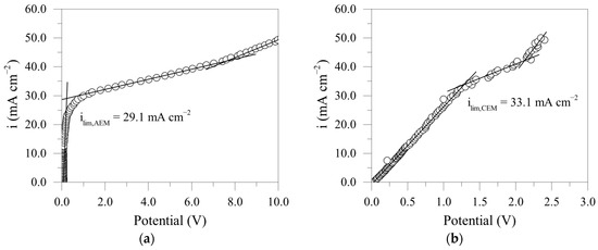 The current–voltage curves are shown in Figure 20, where it can be seen that the AEM limited the current density value to be applied, with an ilim = 29.1 mA cm−2.