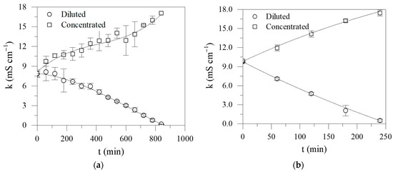 Based on the current–voltage curve results, the current density value to be applied in the electrodialysis experiments with both solutions was limited by the AEM. According to the literature [45], when operating under galvanostatic mode and underlimiting conditions, it is convenient to apply a current density value that corresponds to 70–80% of the limiting one, in order to mitigate the concentration polarization effects. In this sense, for the ED tests with the S1 solution, it was applied at 5.3 mA cm−2 for approximately 840 min, while for the RW solution, the experiments were carried out for 240 min with an imposed current density of 15 mA cm−2. The electric conductivity (k) of the solution in the diluted and concentrated reservoirs was monitored each hour, and the values are presented in Figure 17. Comparing both ED setups for the S1 solution (Figure 17a) and for the RW solution (Figure 17b), it can be noted that this parameter presented a similar behavior, with k values decreasing in the diluted reservoir along the treatment time, while increasing in the concentrated reservoir. This is an expected performance in the electrodialysis process [46] since the ionic species are transferred from the diluted to the concentrated reservoir. Moreover, it indicates a successful demineralization of the working solution, corresponding to a reduction of approximately 98% of the electric conductivity for the S1 solution and 95% for the RW solution.