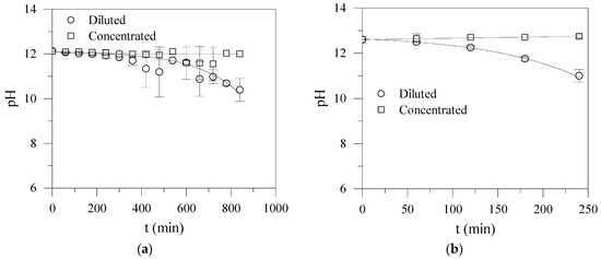 The diluted and concentrated solution pH values for both ED setups were also recorded hourly. As can be observed, the pH of the concentrated reservoir solution remained nearly unchanged during the electrodialysis experiments at a value around 12 and 12.5 for the S1 (Figure 18a) and RW (Figure 18b) solutions, respectively. However, a different behavior was reported for the pH values of the diluted reservoir solution, which presented a decreasing tendency, especially after half of the treatment time. This behavior was also reported in [23] and may be associated with coupled effects of concentration polarization at the interface between the solution and the anion exchange membrane. Since ion concentration is one of the directly proportional parameters in the determination of the ilim value [47], the demineralization of the diluted solution may lead to the system reaching or exceeding the ilim value, and the generation of OH- and H+ due to water splitting in the membrane/solution region may appear. Thus, the OH- may pass through the anion exchange membrane, while the H+ ion may influence the pH value of the solution in the diluted reservoir [48].