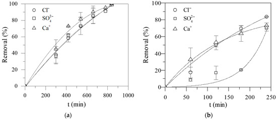 The removal of chloride, sulphate, and calcium ions from the diluted solution is shown in Figure 19. With the S1 solution, it can be noted in Figure 19a that electrodialysis performed better than sorption in removing chlorides, reaching more than 99% extraction of these ions in 800 min, whereas at sorption this value was achieved after more than 1400 min with 150 g L−1 of LDH. However, this behavior is not observed when it comes to the removal of SO42− and Ca+ ions, since the removal rate of these ions was slower than sorption, despite reporting a percent extraction of 99.35% for sulphate and 98.91% for calcium ions. For the RW solution, none of the specified ions reached more than 90% of removal at the end of the ED tests, as can be seen in Figure 19b. The percentage removal of sulphate ions presented a singular behavior, where a considerable increase in its values can be seen after only 150 min. This can be explained by the competition of coexisting anions to pass through the AEM, where the transport of monovalent ions and those with a smaller ionic radius, such as chloride, is favored over divalent ions, such as sulphate [49]. Moreover, sulphate ions species had the lowest value of percentage removal, with less than 70%, compared to calcium and chlorides (approximately 73% and 83%, respectively).