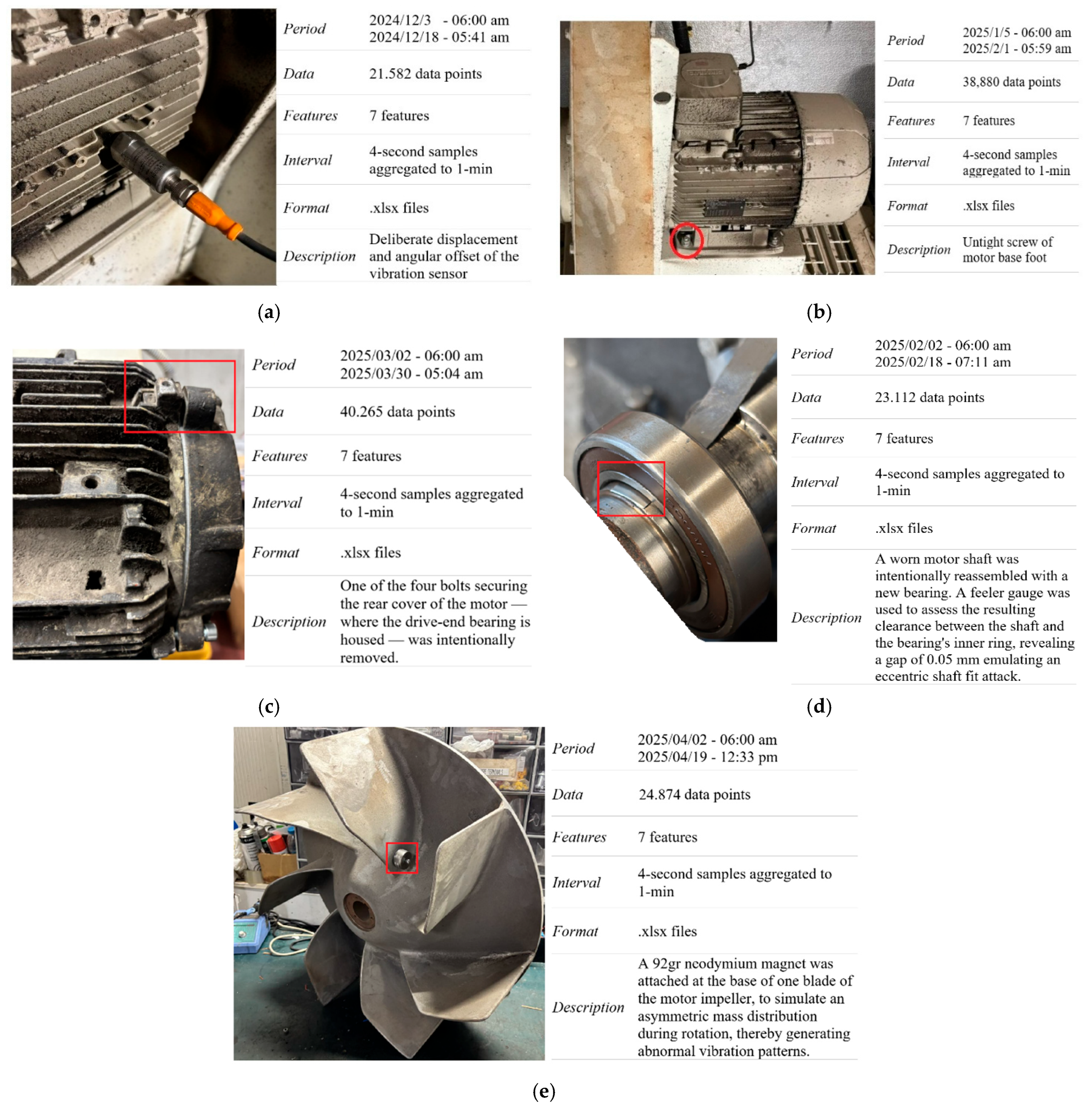 - Loose Motor Foot: One of the mounting bolts of the motor base was deliberately loosened. The bolt was unscrewed with a controlled torque to induce partial destabilization without complete detachment (Figure 4b).